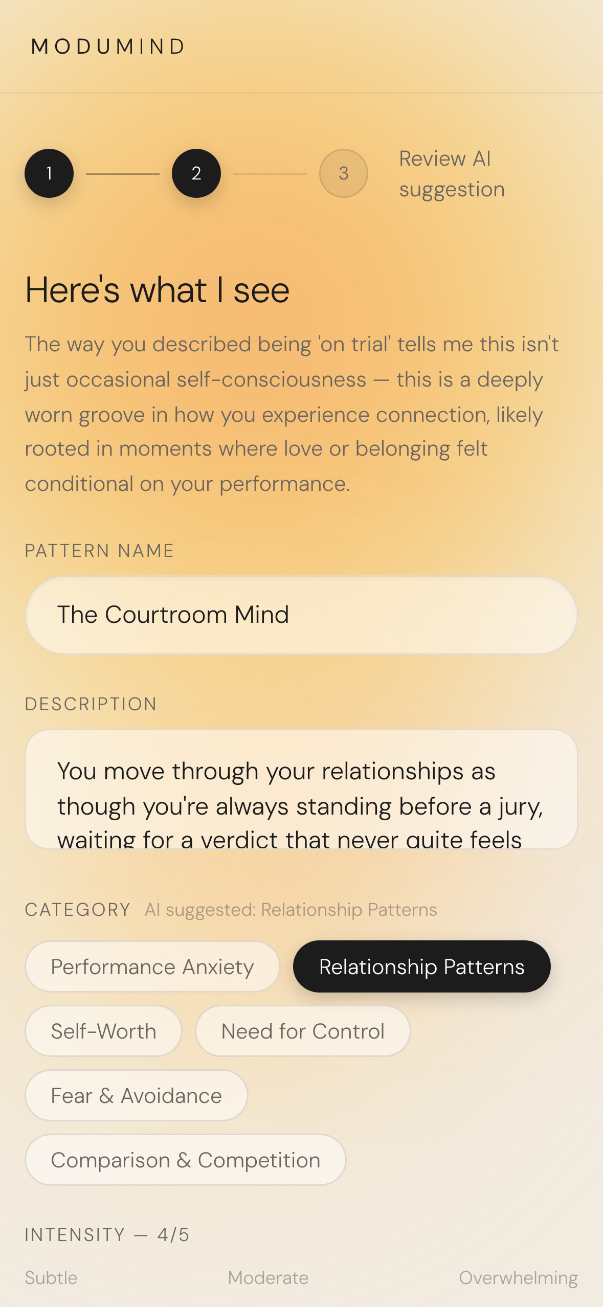 The user types whatever comes out. Claude reads it once and returns a named pattern (here: 'The Courtroom Mind'), a mirroring description in the user's own framing, a category (Relationship Patterns / Performance Anxiety / Self-Worth / Need for Control / Fear & Avoidance / Comparison & Competition), and an intensity reading. Every field is user-editable — the AI is offering, not deciding.