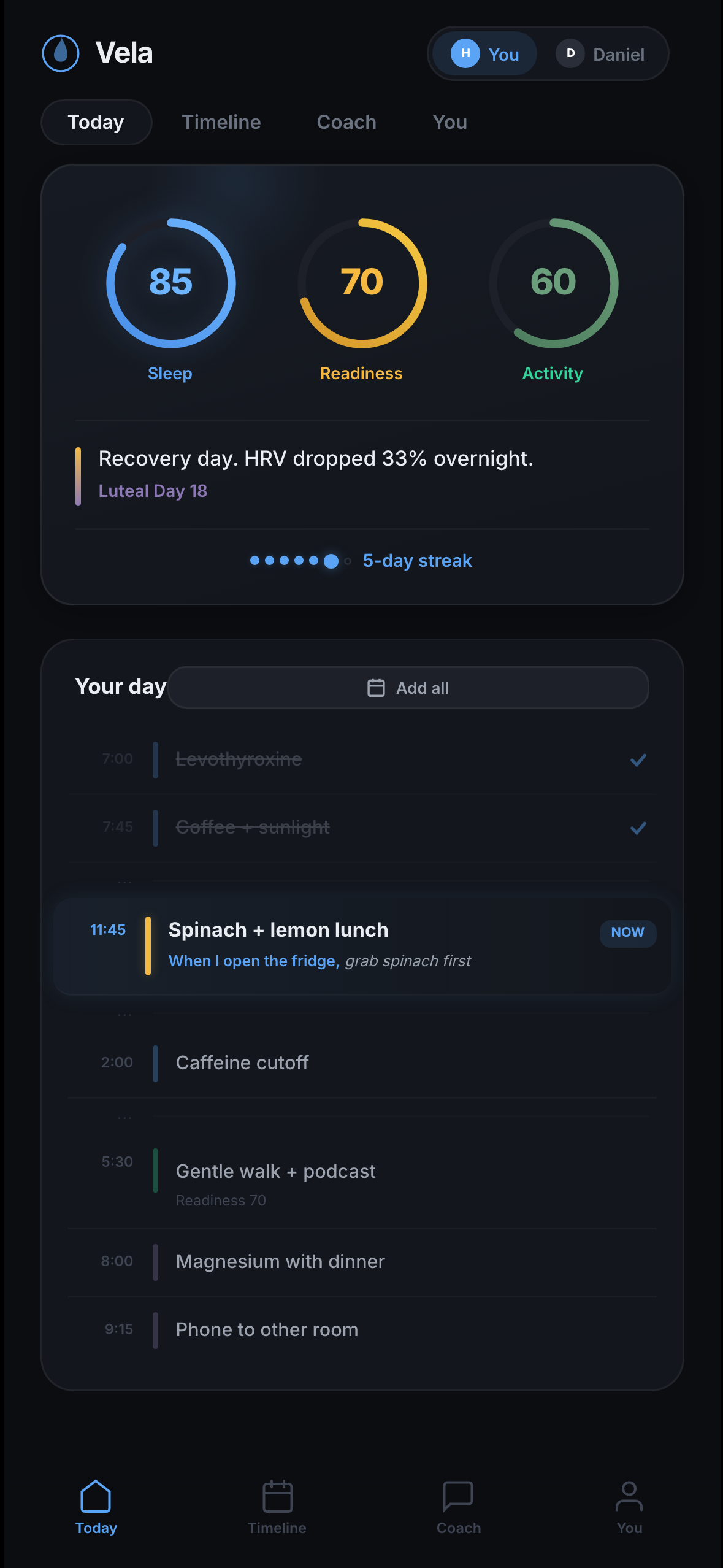Vela is built around four tabs — Today, Timeline, Coach, and You — and a header toggle that switches the entire interface between your view and your partner's. The challenge wasn't fitting more data on screen; it was deciding what becomes a number, what becomes a sentence, and what gets hidden behind a tap. Each surface below is captured from the working prototype.